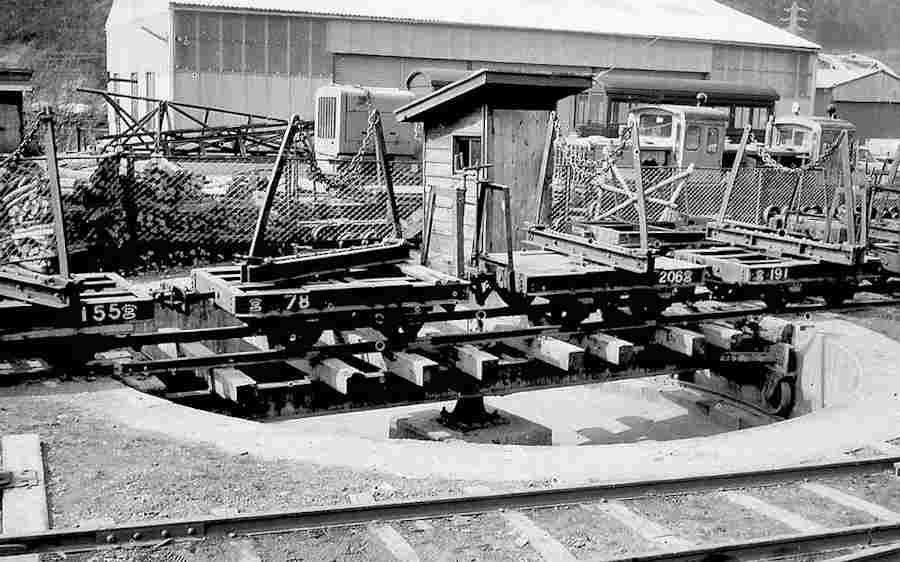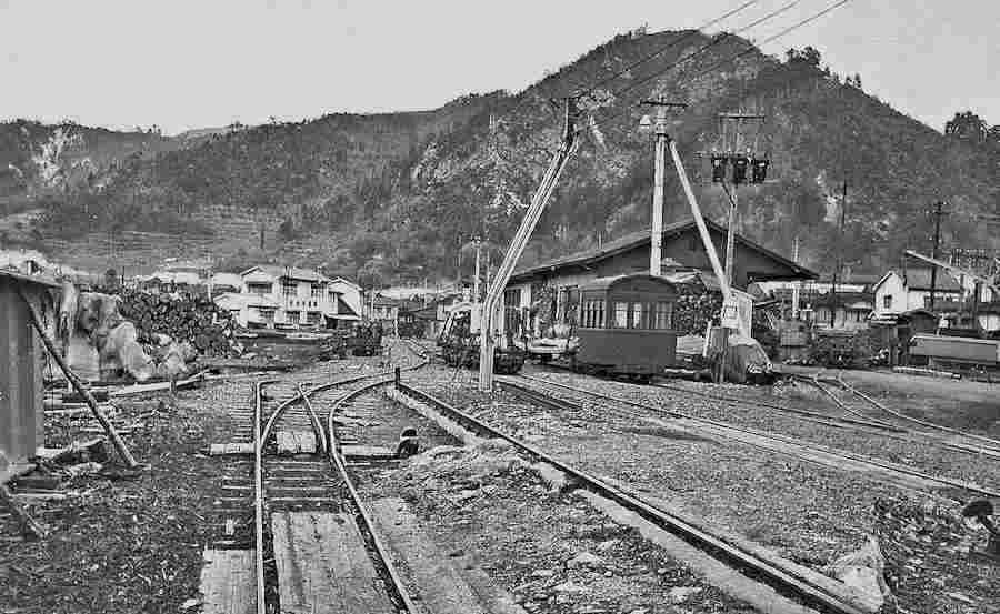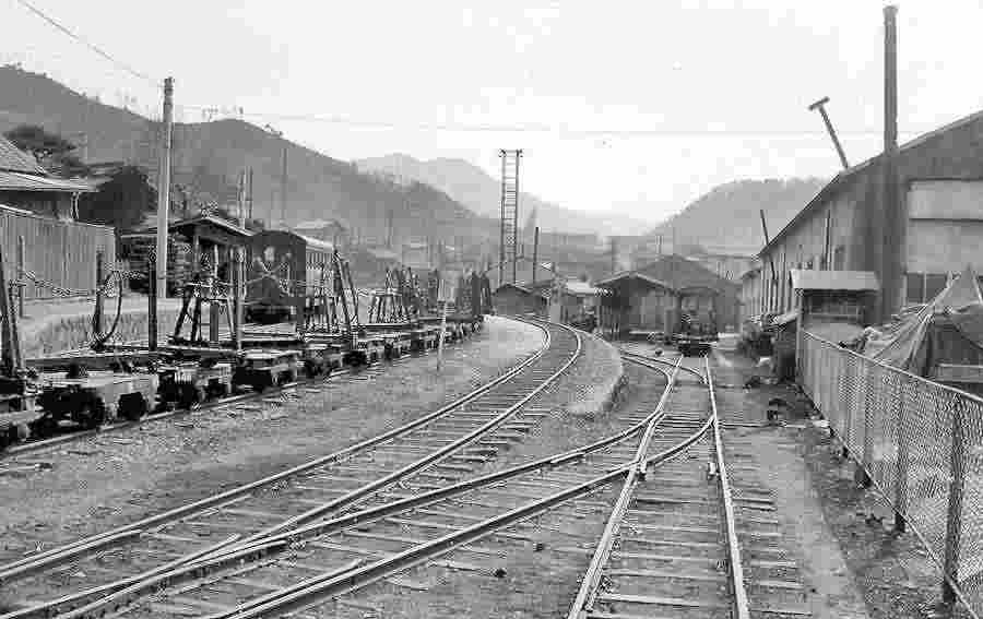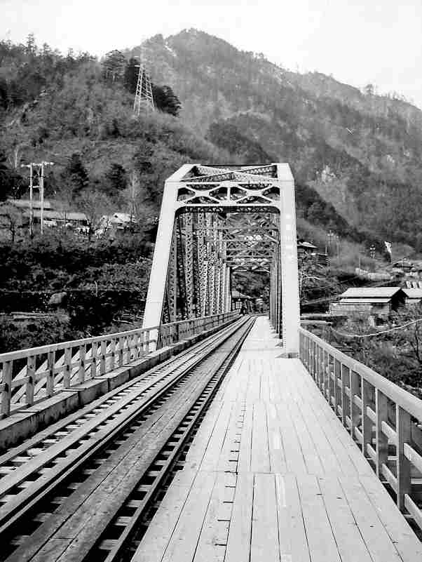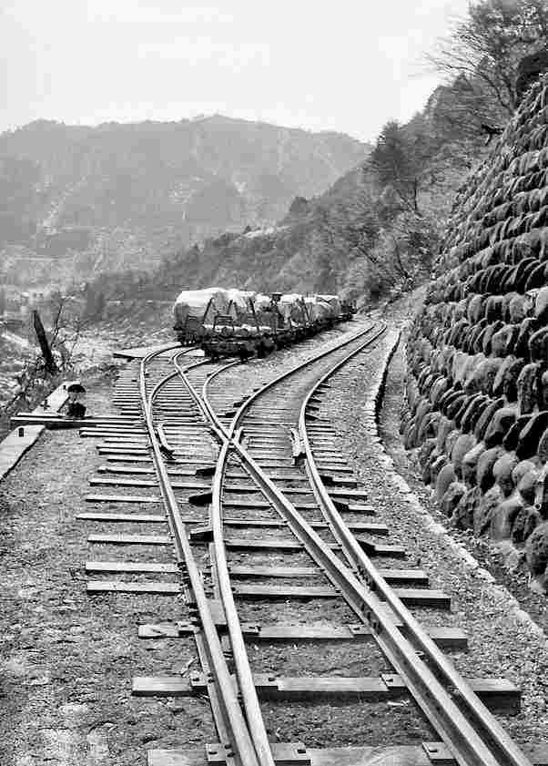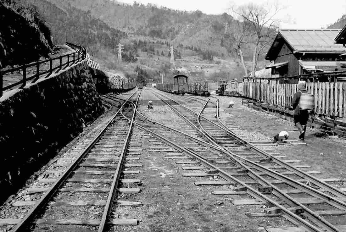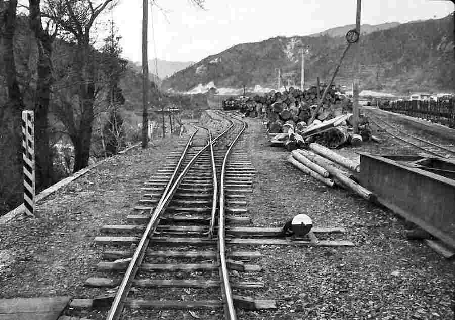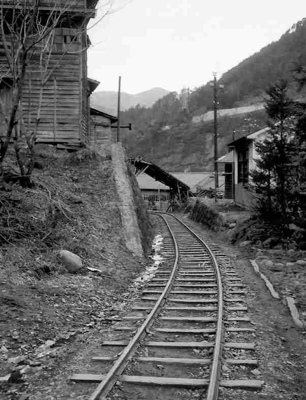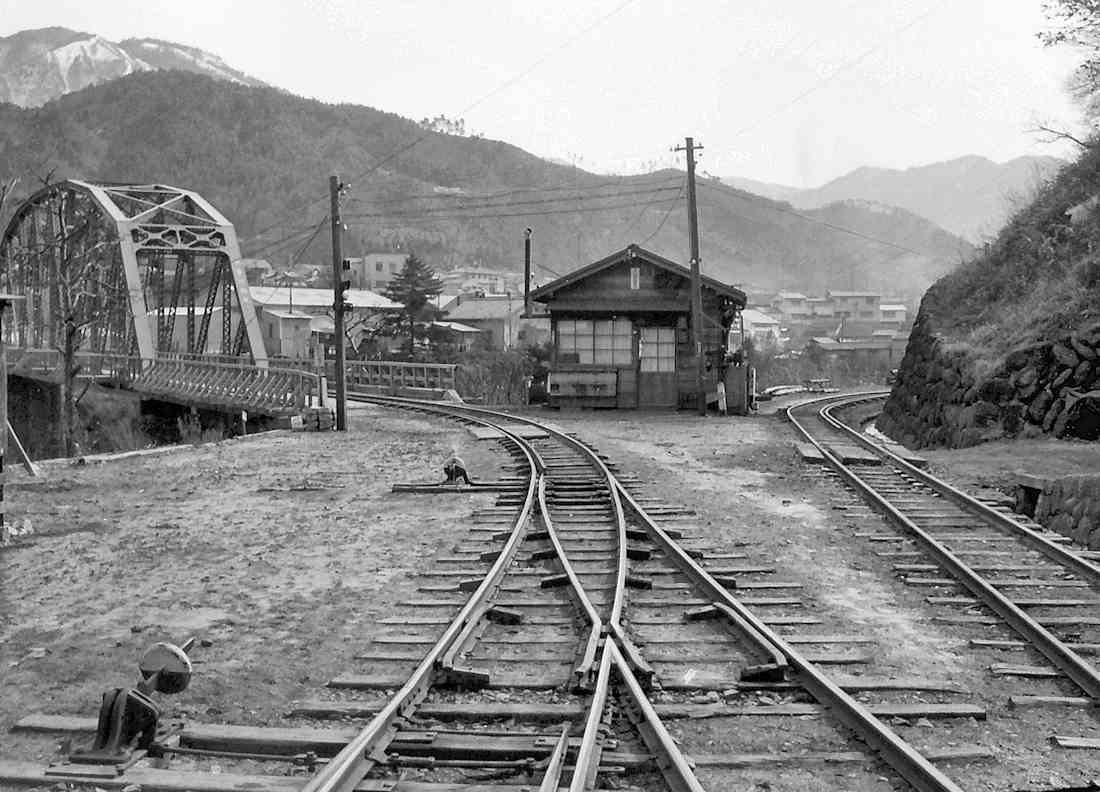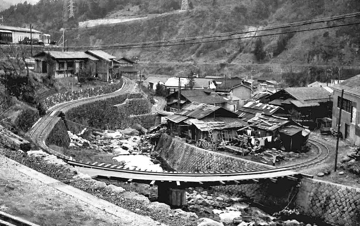 | ★正島貯木場に行くには凄いオメガカーブがありました。更に、木曽川を渡る鬼淵鉄橋の先に1966年には王滝線から反対方向に向かう小川線のスイッチバックがあり、ポイント切り替えの操作小屋もあったのです。 |