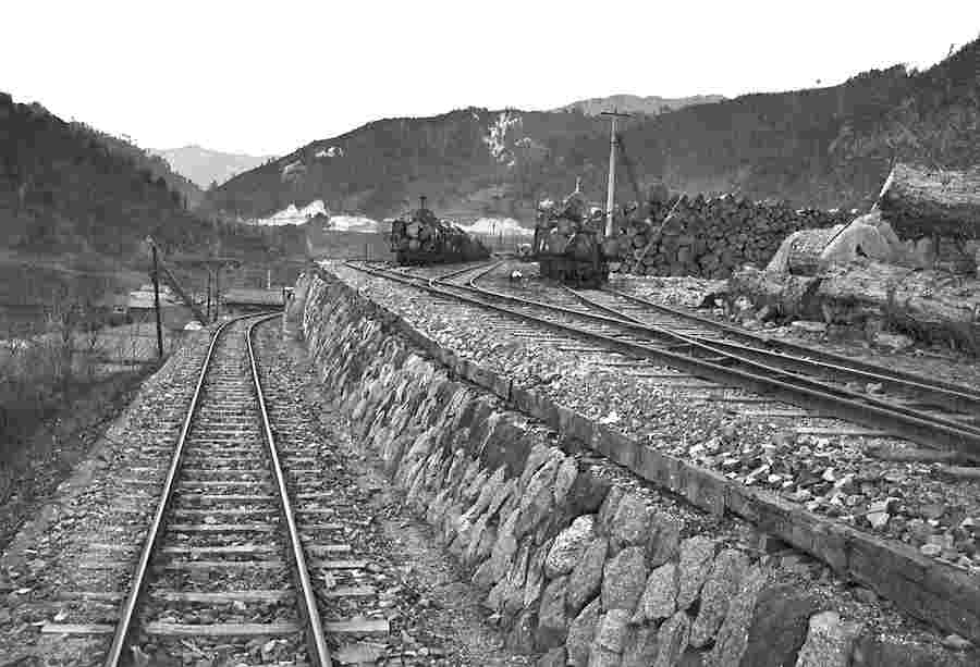 | 小川線が廃止になった後、王滝線だけになってからは、恐らくそれほど変化はなかったはずなので、両氏の写真を分けて貼るだけにします。今さら、この枝線はもうなかった、と指摘されても、我々には検証のしようがありません。 なぜならば、この路線に一度深く突っ込むと、もう収拾がつかなくなることが確実だからです。70年前後はこんな感じの森林鉄道だったのだ、とイメージされることだけで十分だと思います。 |