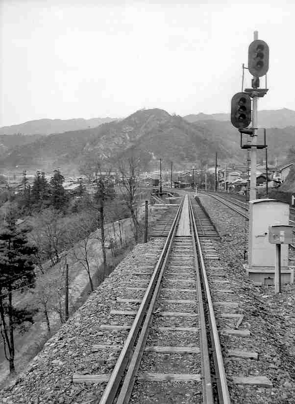 | 同場所で反対側を撮ってみました。左は上松に向かい、右側が鬼淵駅の手前のヤードでスイッチバックして小川線で赤沢に向かう線路と想像できます。手前は王滝線のヤードです。この正面の建物がここの複雑な線路切り替えを操作していた、信号小屋です。この日は日曜日だったため、職員はおらず、カーテンで締め切られています。まだ直前まで小川線が生きていた時代です。全て手動テコです。 |