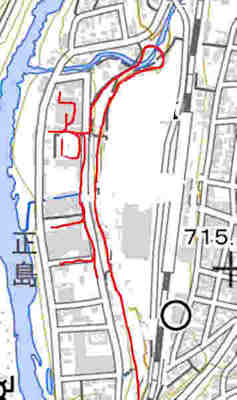 | もっと先に行きます。数多くの線路が分岐していて複雑です。左側の砂利の色が違う単線の線路は、中央西線です。こんなに隣接していたのに、木曽森林の貯木場があった記憶などありません。 |