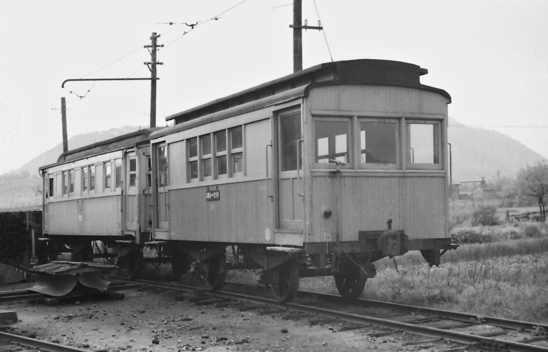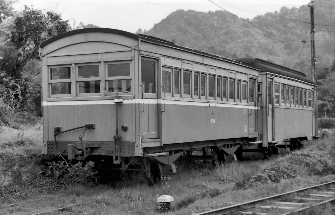 | 手間駅の留置線には付随車2両が放置されていました。前方のダブルルーフはフ55号で、手前がフ50号です。貨車の様な板バネの単車で、国宝級の車両ですね。これと、デハと組んで走っていた時代に撮りたかったですね。窓の作りも独得です。 |