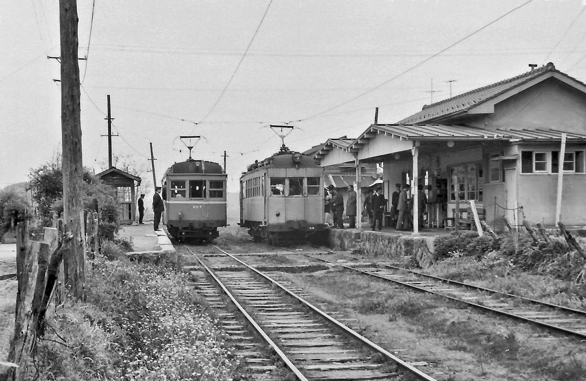 | 手間駅での交換風景です。右は法勝寺行のデハ201、左が米子市行のデハ207です。デハ201は恐ろしく汚くなっています。これも手入れをせず、雨水垂れ流しのせいでしょうか。それに比べると207はまだまだ使えそうに見えます。最後までここは有人駅だったのですね。乗客の割に駅職員が多く見えます。ここの電車は日本では珍しい「Y字形」のビューゲルが多く見られました。 |