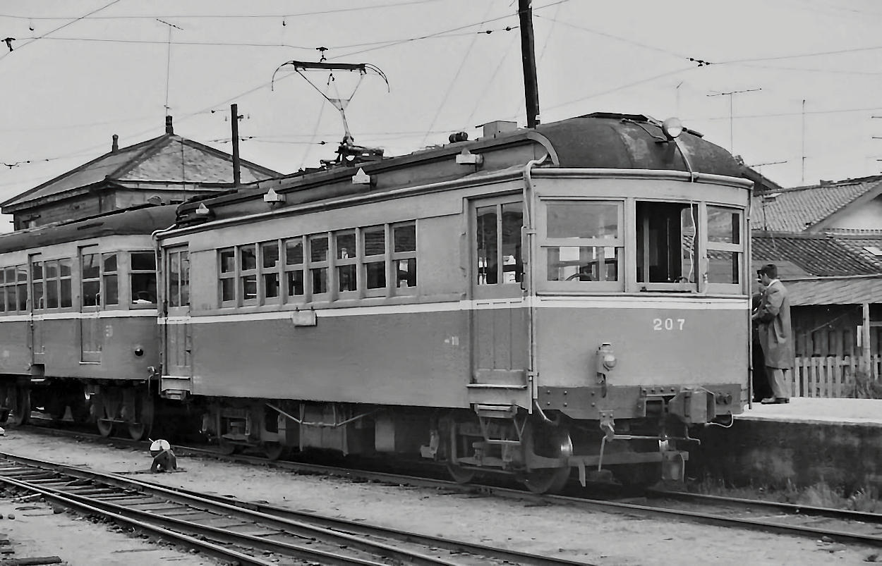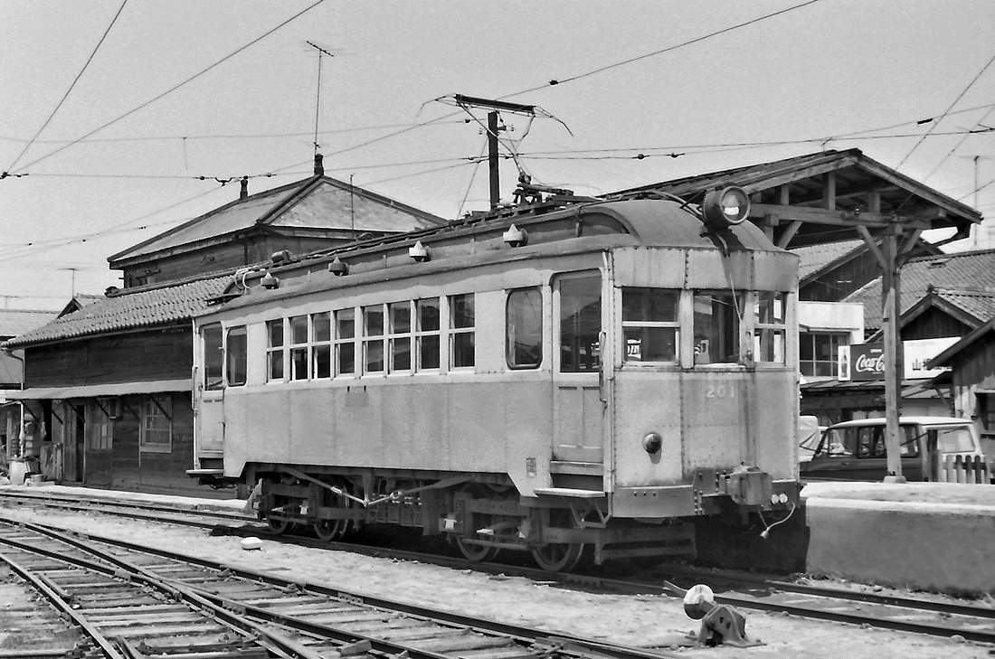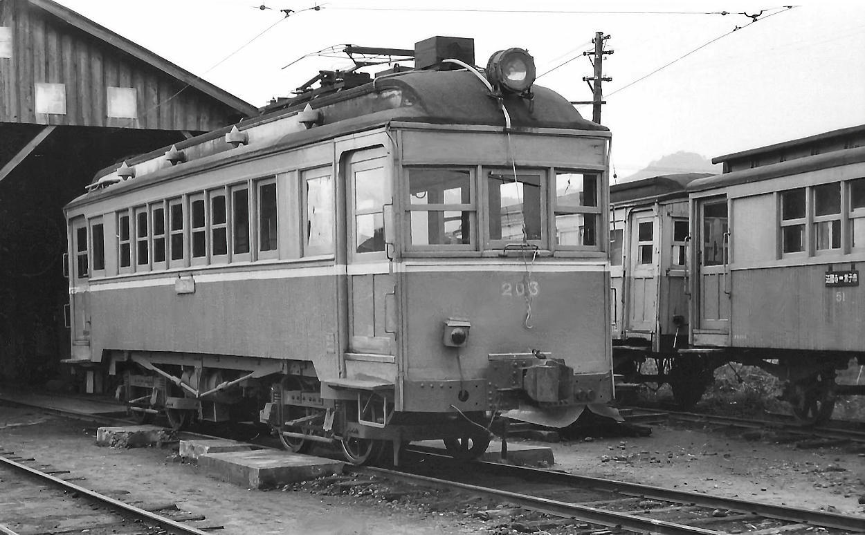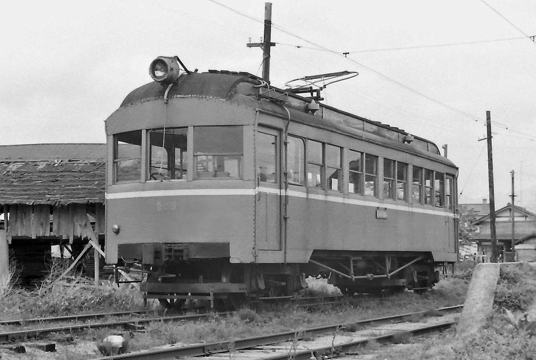 | その終点駅・法勝寺に既に留置されていたデハ205号です。雨水が垂れ下がって側面は筋が出来ています。もう手入れもなされていなかったのでしょう。もとは尾西鉄道にいた車両です。大型のビューゲルを使っています。前面は雨樋もついていません。 |