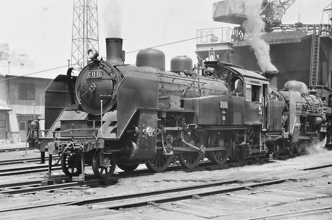 | 氏は法勝寺線の撮影の後、米子機関区に立ち寄ったそうです。かつてC54が終結していましたが、時代はちょっと遅かったようです。これは有名なゾロ目のC1111です。いいところに停まっていました。米子鉄道管理局の蒸機はシールドビームが多かったですね。 |