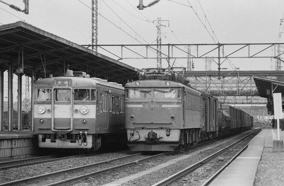 | 土浦駅で401系上り電車と並びました。中線で特急「みちのく」を退避します。EF80 の前窓上のヒサシは雨水による腐食よけだそうです。顔つきが変わりましたが、やはり原形がいいですね。 1975年7月 土浦駅 |