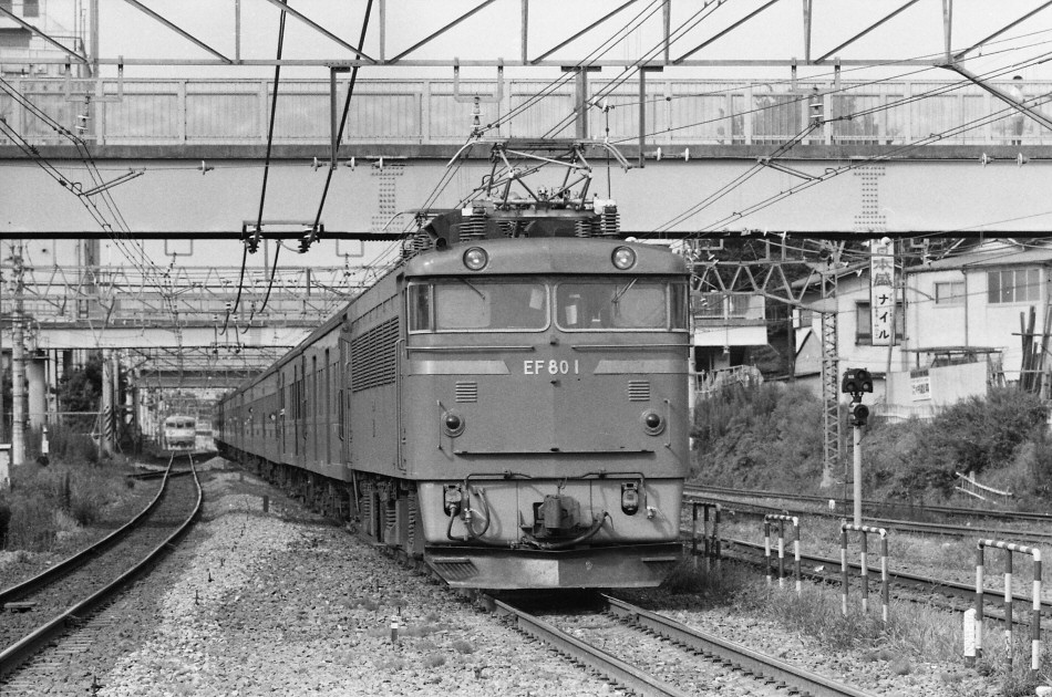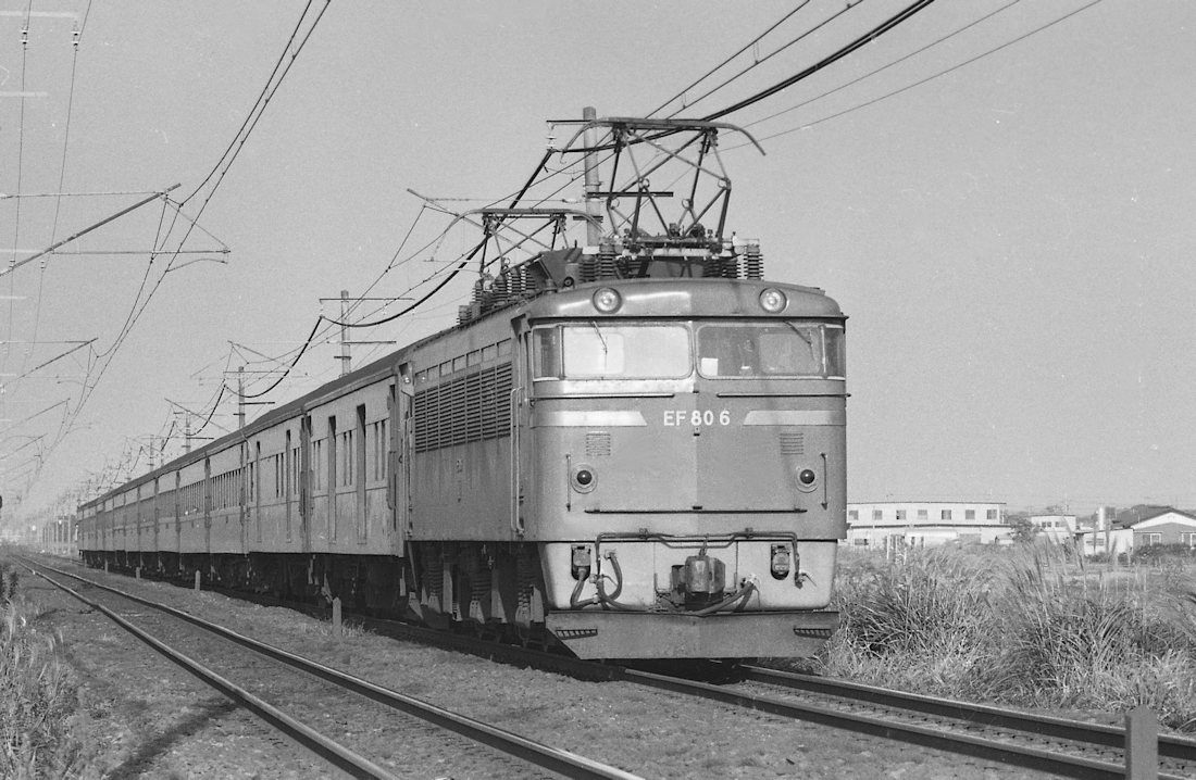 | 常磐線は1963年に勝田まで電化されましたが、取手と藤代間で、直流から交流電化にされたため機関車は交流対応も必要となり、ここに初めて本格的な交直両用のEF80 形が登場しました。この機関車は典型的な箱型で特徴もなく、とても地味な機関車でしたが登場時は初めて「ローズピンク(赤13号)」の塗装を纏い、ファンにとっては驚きの機関車だったのです。更に、他線に移ることなくEF 81 の登場まで常磐線のみで活躍しました。 |
