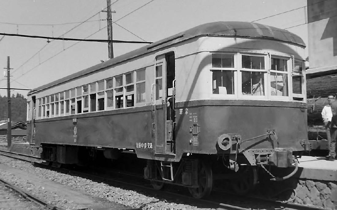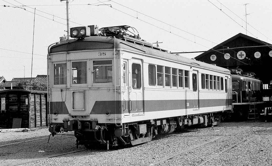 | 開業時には貨物輸送用電機のデキ53と電3形 (101、102) を新造したようですが、その写真はネットで探しても出てきません。FT氏は昭和41年に訪れていますが、この時は貨物は走っておらず、本格鉄道に相応しい電車がまだ残っていて、その堂々たる車体には驚かされます。これは製作年次は逆になりますが、1929年生まれの両運転台モハ1形です。1938年にモハ10形に改称、更に1938年にはモハ30形に改称され、当日は37号が走っていました。本長篠で田口線の37号に乗り込む前です。(撮影者の行動順です) |