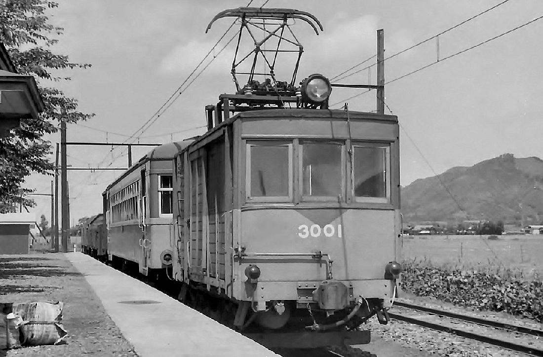 | 八郎潟駅到着のデワ3001です。ここでは、開通当初はなんとガソリン機関車(気動車ではない)でしたが、非力だった為使えないことが判明し、その後、蒸気機関車(米ミルウォーキー社製)で営業を行ったといいます。戦後、電化されても、ディーゼル機関車が使用されましたが、重量等の問題で使用を中止し、最終的に電動客車(デワ)が客貨を牽引することで落ち着いたという、電化なのに電車を使用しない、変わった鉄道でした。デワとは一言で言うと「電動貨車」という貨車スタイルの電動車で、実質は牽引電車であったのです。素人では、わずか3,8キロにこれだけ金をかけて走らせた意味があったのか、と思ってしまいます。 昭和43年9月 |