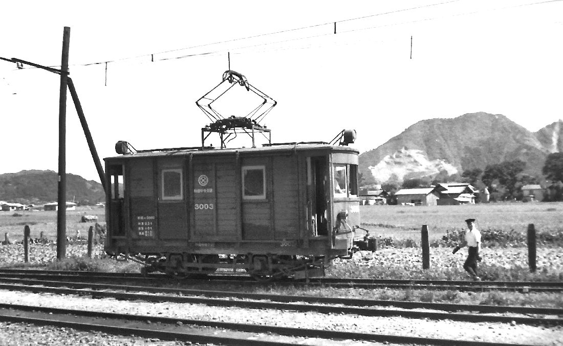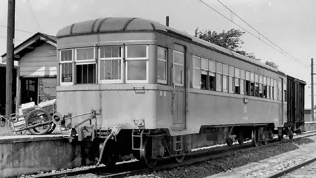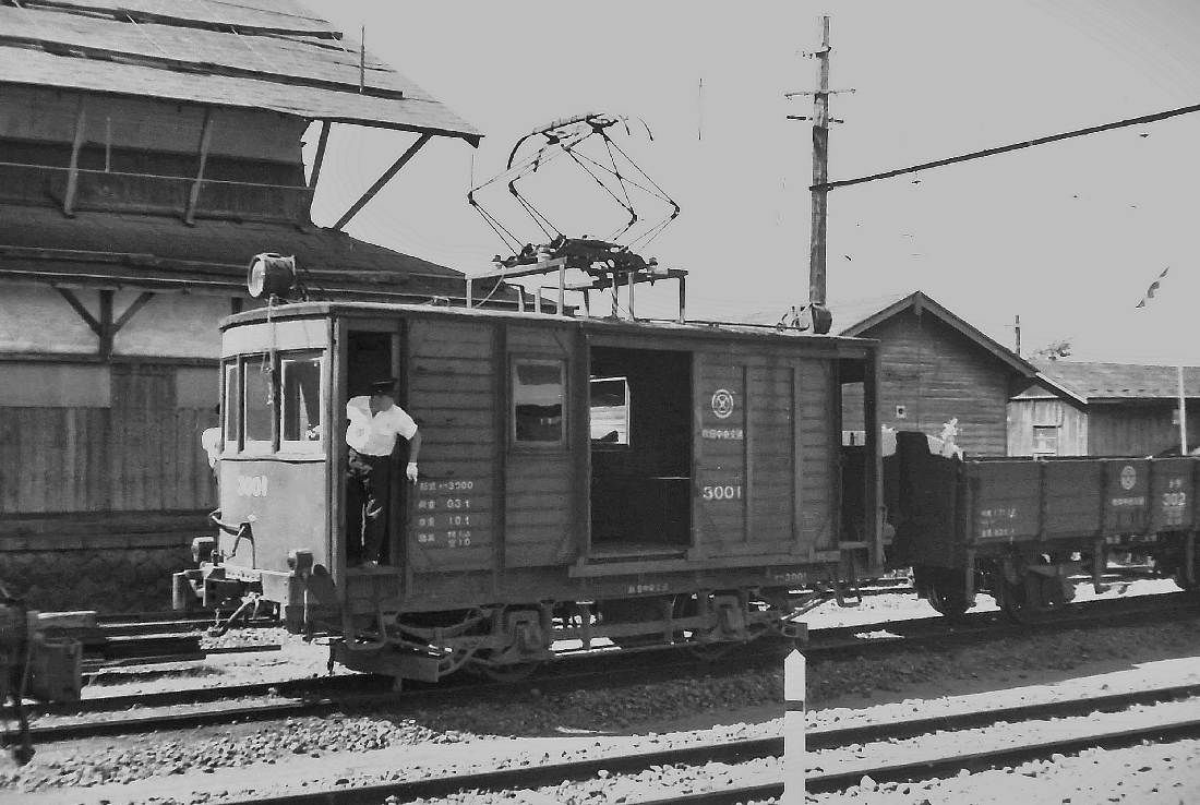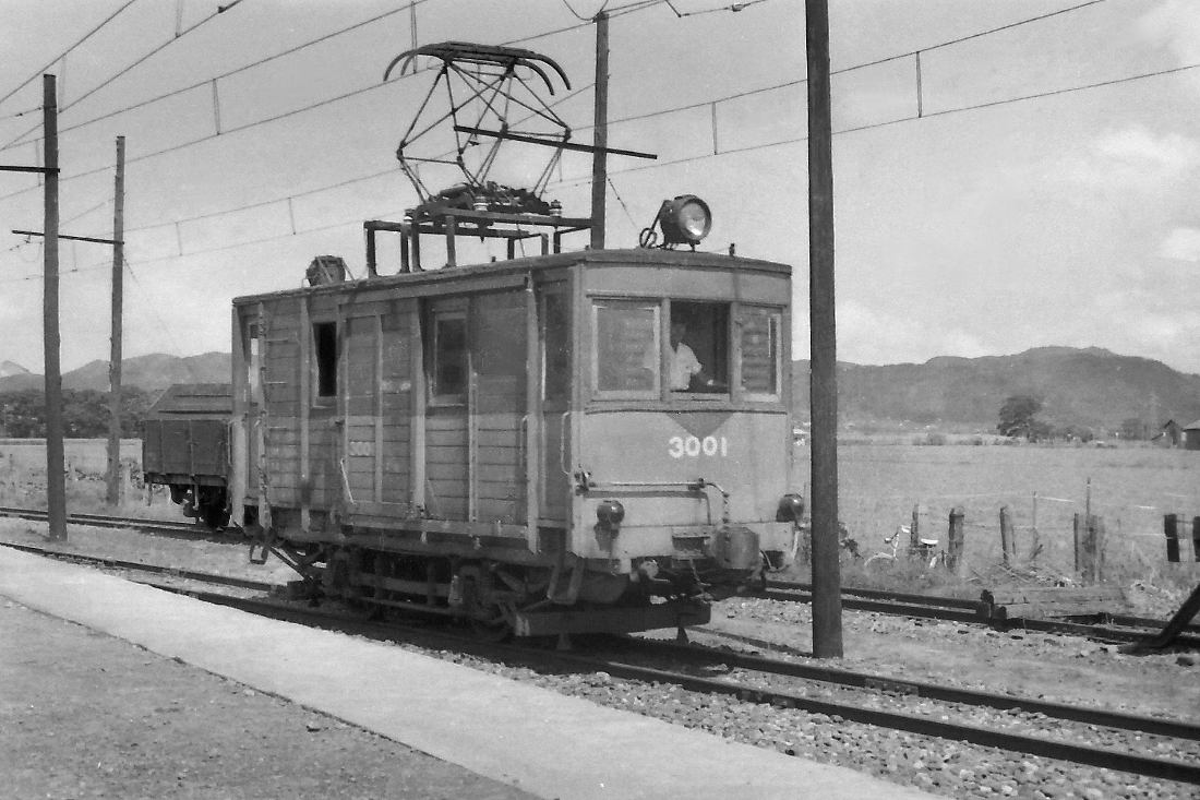 | デワ3003です。これも東急から来たものが改造され、後年の主力電動車として活躍しました。東急時代と違い、ここでは電動牽引機であるので、改造は多少大がかりなものだったようです。牽引車としての最低条件の機器を積み込んだためです。 八郎潟構内 41年9月 |