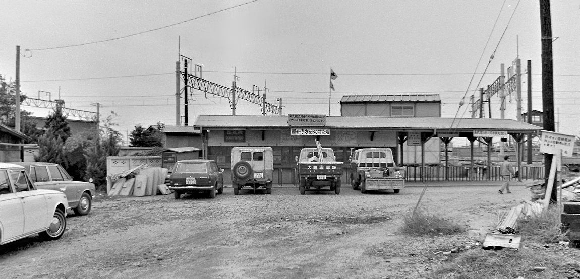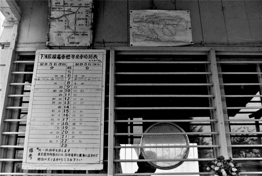 | 切符売場窓口です。47年10月改正の時刻表が出ています。何かで、競馬開催日以外は無人駅だったと読んだ記憶がありますが、これを見ると、切符売り場には職員がいるように見えます。上に貼ってある路線図も汚なかったんですね。 ★以上、今から思うと、近郊なのに分からないことが沢山あることに驚きます。 |