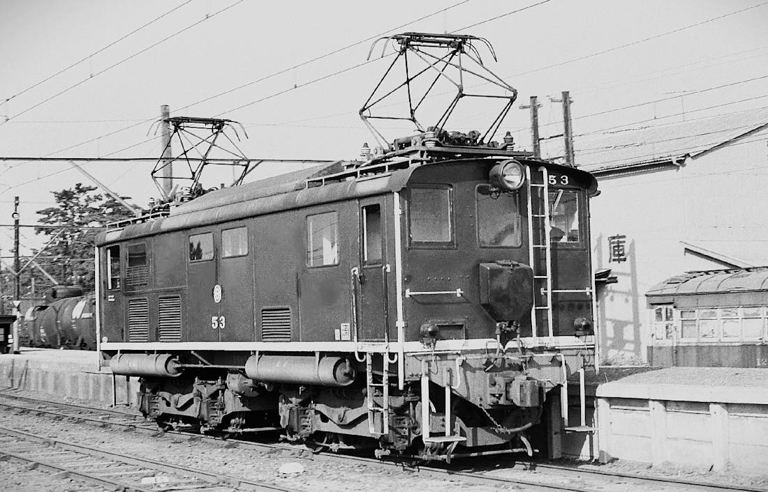 | 大事な写真を忘れていました。田口線開通時に新造されたデキ53形で、この1両だけが田口線所有でした。これで木材が輸送されたのでしょう。しかし同機は田口線廃線と同時に豊橋鉄道渥美線に転じ、1968年には豊鉄番号のデキ451となりました。私は田口線での原形を知りませんので、豊鉄でどのように変わったかは分かりません。但し転属に際し、降圧工事が行われたことは間違いありません。写真は68年の再改造直前ですが、恐らく田口線時代とほぼ同じ外観のようです。この時は53号の番号がまだ残っています。その後、渥美線電車と同色となり改造もされ、往年の堂々たる姿が台無しになりました。 1968年4月 FT氏撮影 高師にて |
