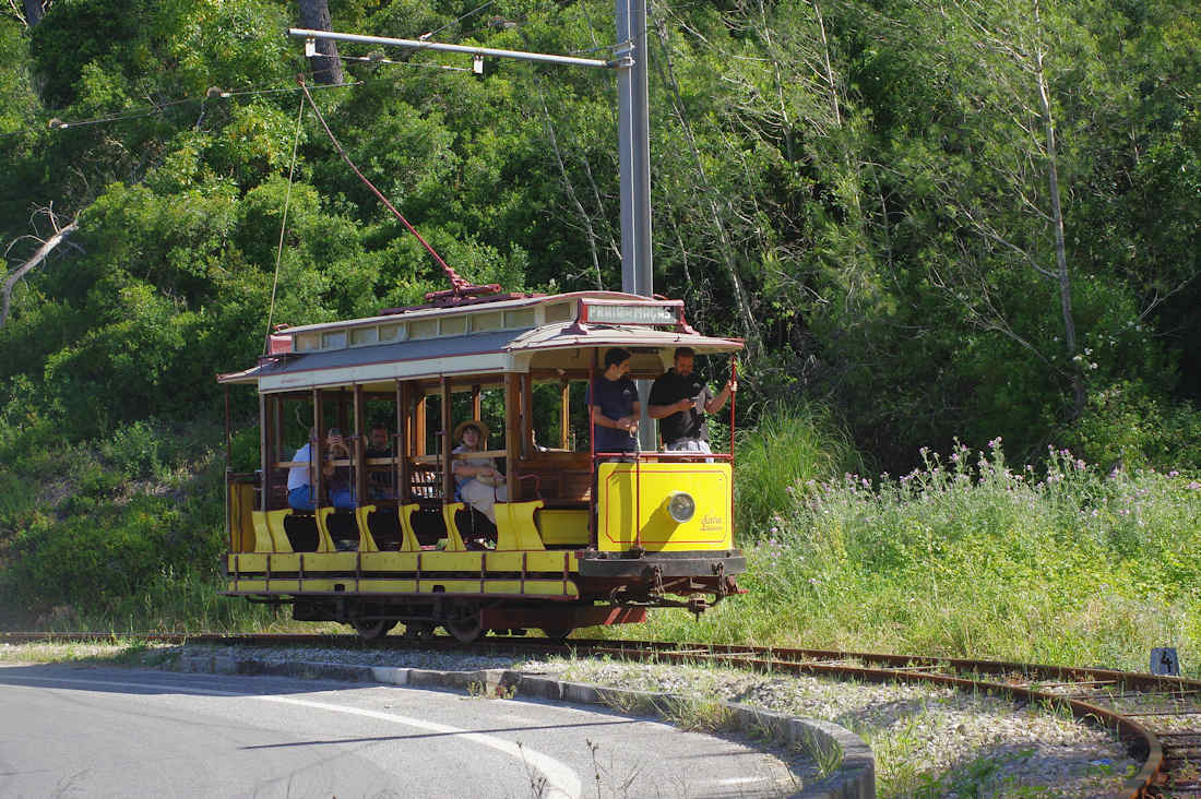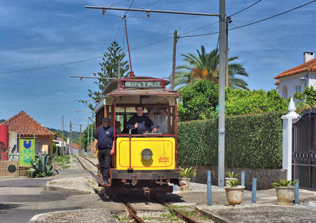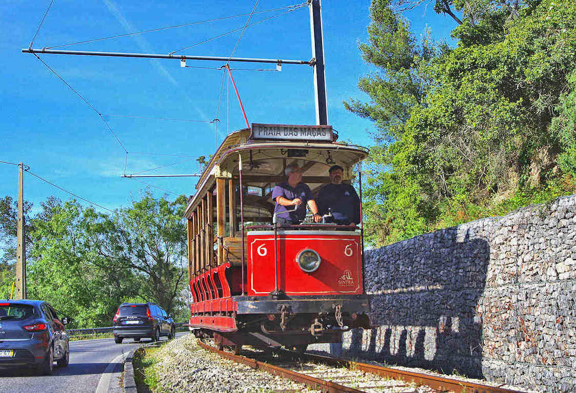 | リスボンを満喫した後、リスボンのロシオ駅から近郊鉄道(CP)のシントラ線でほぼ40分でシントラ駅に着きますが、ここから面倒です。ロカ岬行バスだとわかりやすいのですが、ロカ岬観光ではなく、このトラム撮影が目的なので、少し歩いて、紛らわしい「シントラトラム=Eletrico de Sintra」に行ってそこで乗り換えます。ただここは、事前に観光トラムが走る日を調べて、計画を立てないとトンデモナイことになります。2日で数本しか撮れない極めて地理的、時間的にも不便なトラム路線です。道路が線路脇を並行して走っているので、クルマと被るし撮れる場所は限られるので、撮影地を決めるのがまず大変です。しかし、ユーラシア大陸の最西端まで行くのですから、覚悟は決めないと行けません。 |